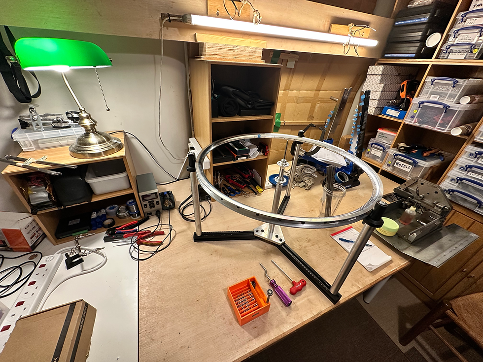 Bicycle wheels built with a Noble lacing jig, a modified Part Tool TS 4.2 truing stand, Mitutoyo 2047A dial indicators, high geometric accuracy and tension equalised to abt 5%. Build documentation included.